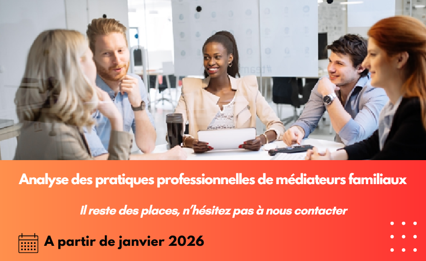 Conformément aux textes qui réglementent le métier des médiateurs familiaux l’Analyse de la Pratique est obligatoire dans le cadre de l’exercice de la médiation familiale mais aussi, pour la présentation des dossiers de demande de Validation des Acquis et de l’Expérience, qui permettra le maintien de ce métier. L’Analyse des Pratiques Professionnelles permet de renforcer et/ou de développer les acquis théoriques et d’éviter les risques de « dérapages » professionnels, d’alliance tout en actualisant ses connaissances théoriques.