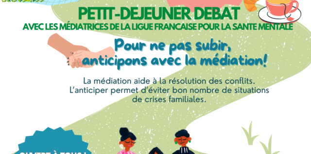Petit-déjeuner débat avec les médiatrices de la Ligue Française pour la Santé mentale – Jeudi 16 octobre 2025 de 9h à 10h30 La médiation aide à la résolution des conflits. L’anticiper permet d’éviter bon nombre de situations de crises familiales. Continuer la lecture Pour ne pas subir, anticipons avec la médiation!