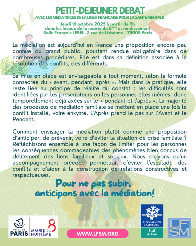 Petit-déjeuner débat avec les médiatrices de la Ligue Française pour la Santé mentale – Jeudi 16 octobre 2025 de 9h à 10h30